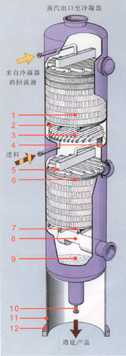 1、規(guī)整填料 2、支撐柵板 3、液體收集器 4、集液環(huán) 5、多級(jí)槽式液體分布器 6、填料壓圈 7、支撐柵板 8、蒸汽入口管 9、塔底 10、至再沸器循環(huán)管 11、裙座 12、底座環(huán) 此結(jié)構(gòu)適合于直徑大于等于800mm的填料塔。 |