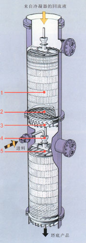 1、規(guī)整填料 2、支撐柵板 3、液體收集器 4、降液管 5、管式液體分布器 此結(jié)構(gòu)適合于直徑小于800mm的填料塔。 |